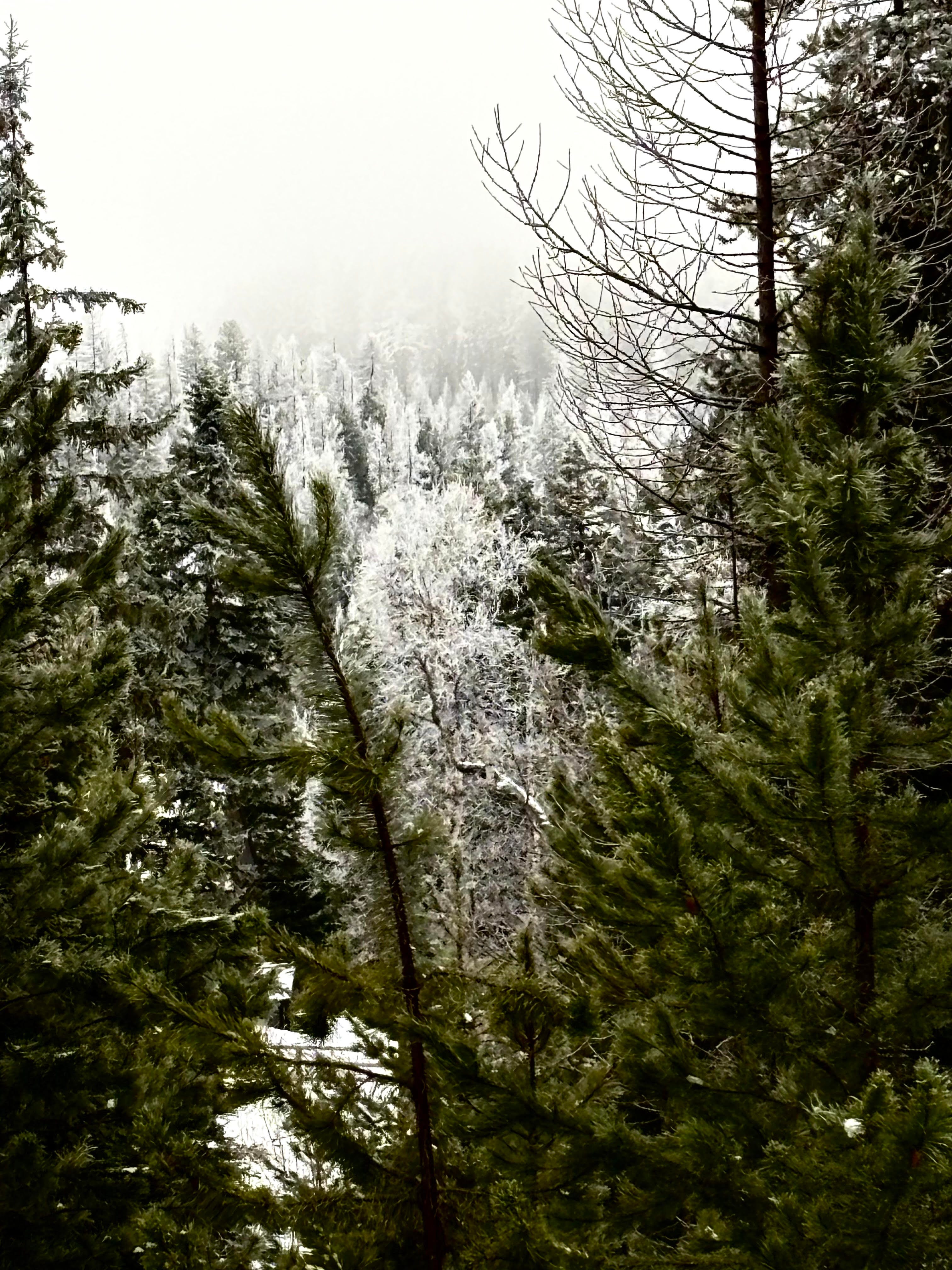 But standing there in the cold, I saw something else: trees covered with frost, creating a stunning contrast of deep green and frosted foliage. Beauty emerging in the middle of thick fog.